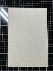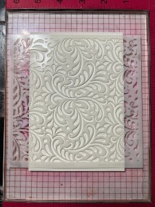 Taking the large stitched rectangle from my Master Layouts 8 Die Set, I cut out of the same Watercolor Cardstock, running them through my Intri-Cut. To add some texture to my backdrop, I place the panel onto my grip mat then place the my Harvest Flourish Stencil over the panel. Taking my Blending Brush, I blend Whisper Ink over the stencil, keeping the ink a little lighter towards the edges of the panel. Because my panel is bigger than the stencil, I move the stencil to the top and bottom and blend, filling in the empty spaces.