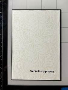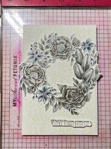 To figure out my sentiment placement, I place the panel back into my MISTI and position my wreath where I think I will want it, then choose a sentiment from the Spring Clusters Stamp Set and stamp it onto my panel using Amalgam Obsidian Black Ink. Next, I take the largest rectangle die from the same Master Layouts 8 Die Set and cut out of Black Cardstock, running them through my Intri-Cut. Using Liquid Glue, I adhere my panels together.