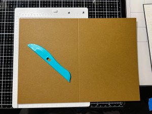 For my card base, I cut a 7″ x 10″ piece out of Warm Cocoa Cardstock using my Guillotine Paper Trimmer then score at 5″ using my Scoring Board, I now have a 5 x 7 card base. I then use Liquid Glue to adhere my panel onto the card base. To adhere my wreath onto the card front, I add Foam Tape to the back then mount it onto my panel.