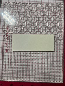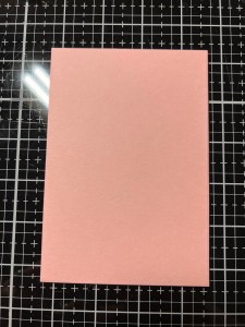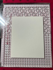 Next, I take the large rectangle die from the same Master Layouts 17 Die Set and cut out of Innocent Pink Cardstock, running them through my Intri-Cut. Using Liquid Glue I adhere my two panels together. For a card base, I cut a 6″ x 8 1/2″ piece out of Whisper Cardstock using my Guillotine Paper Trimmer and score it at 4 1/4″ with my Scoring Board. Using Liquid Glue, I adhere my panel onto the card base then mount my image just over the ink blended shadow.