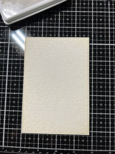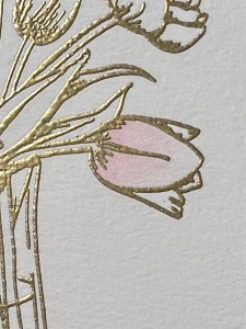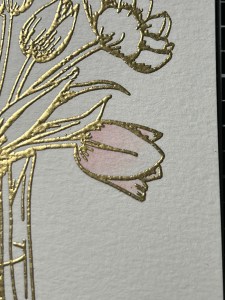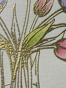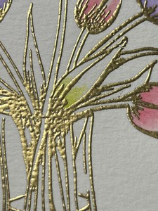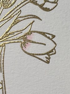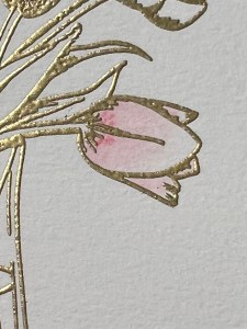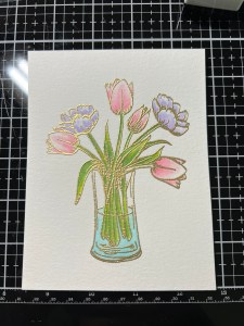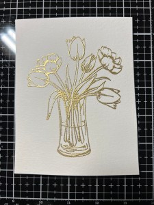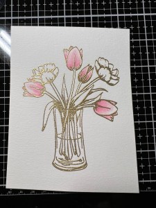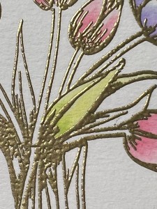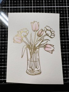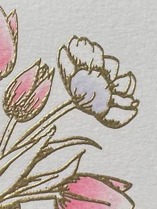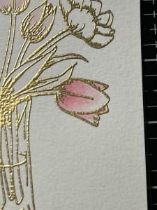 To start my project, I place a piece of Watercolor Cardstock onto the Grip Mat that I have in my MISTI Stamp Positioner. I then prep the cardstock with Anti Static Powder and stamp my large image from the Beautiful Tulips Stamp & Die Bundle, using Versamark Ink. I then remove the cardstock from my Grip Mat and add Gold Embossing Powder and heat set with my Heat Tool. ***I just purchased Gina’s Background 2/Grip Mat that I keep in my MISTI. I use the smooth flat side for holding down my cardstock securely, eliminating the need for magnets. The other side of the grip mat has two textured background designs that can be used to stamp beautiful backgrounds! I use this new grip mat for all of my stamping in my MISTI, and keep the old one for ink blending my panels, this avoids ink staining on the new one.