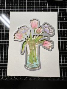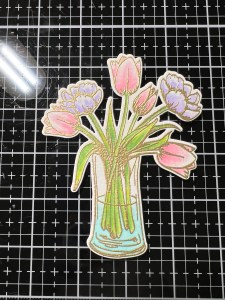For the leaves, I pick up Key Lime Ink with my Water Brush and apply it to the base then blend it out. I then add Grass Green Ink and blend it out, but not all the way to the tips. The shade I’m looking for isn’t quite dark enough, so I add a little Medium Spruce Ink and blend it out. I repeat these colors for the stems as well. For the water in the vase, I add Sea Glass Ink and blend it out. Now that my watercoloring is complete, I take the coordinating die from the same Beautiful Tulips Stamp & Die Bundle and cut out my image, running them through my Intri-Cut Die Cut Machine. *Some of the shading on the leaves and water ended up being a bit darker than I had wanted, so to fix this, I brushed a little clean water over the areas that were too dark and then lifted some color with a paper towel. This is a great way to remove some of the color for a softer look.