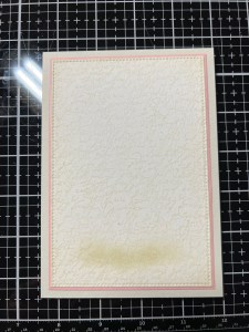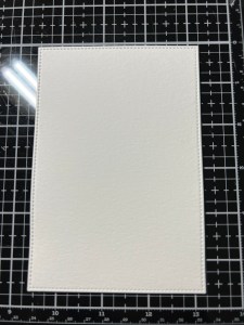 For my background, I take the large stitched rectangle die from the Master Layouts 17 Die Set and cut out of the same Watercolor Cardstock, running them through my Intri-Cut. To add a subtle design, I use Whisper Ink and stamp my panel with the Elegant Script Background Stamp. To give my panel a finished look, I blend the same Whisper Ink around the edges, using my Blending Brush. I want to add a grounding shadow for the vase of my image so I use my Mini Blending Brush to blend Whisper Ink just below where my image will sit.