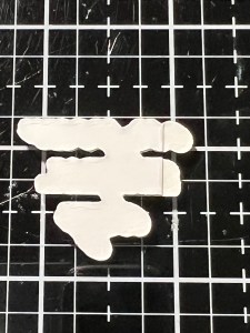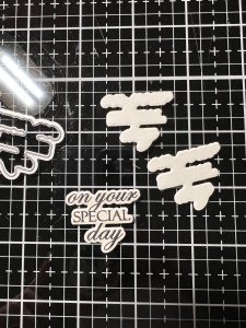 Using Liquid Glue I stack and adhere the two white die cuts together. Because my greeting will be overlapping my image, I cut off the left edge of the stacked die cuts then adhere the greeting on top, add Liquid Glue to the back and adhere the greeting onto my card front.