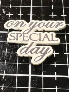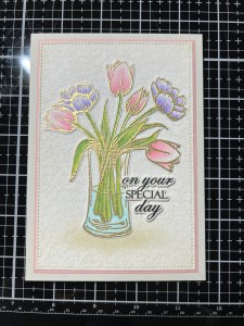 Now, it’s time to work on a greeting. I take a scrap piece of the same Watercolor Cardstock and lightly blend Whisper Ink where I will be stamping my greeting. I do this to dull down the stark white of the cardstock. I then place the cardstock into my MISTI and stamp a greeting from the Beautiful Tulips Stamp & Die Bundle using Amalgam Obsidian Black Ink. Taking the coordinating die from the same Beautiful Tulips Stamp & Die Bundle, I line up the die and run them through my Intri-Cut, I also cut two more times from the cardstock.
