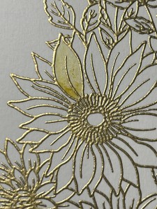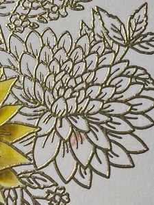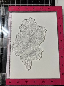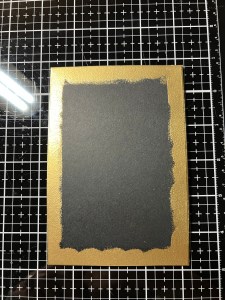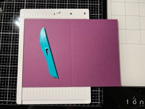 I originally thought I would mat my panel onto black cardstock, then changed my mind to gold. Rather than cutting another panel, I ran my Versamark Ink Pad over all four sides of my previous cut panel then added Gold Embossing Powder and heat set with my Heat Tool. Using Liquid Glue, I adhere the two panels together. For a card base, I cut a piece of Plum Punch Cardstock to be 6″ x 8 1/2″ using my Guillotine Paper Trimmer. Using my Scoring Board, I scored this panel at 4 1/4″ creating a 4 1/4″ x 6″ card base. Using Liquid Glue, I adhered my panel to the base.