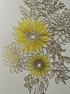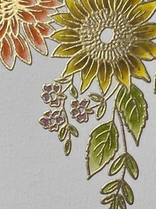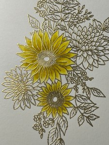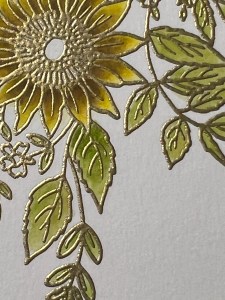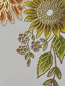 For the tiny flowers, I add Plum Punch Ink to each petal. Because these flowers are so small I don’t add another color, however, I do go back and add a couple more layers until I have a shade I’m satisfied with. For the centers of these flowers, I add Prickly Pear Ink. I did add a very small amount of Dark Sage Ink to just the base of the leaves to darken them up a little. To finish, I add Dark Chocolate Ink to the centers of the two sunflowers.