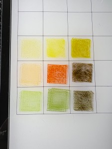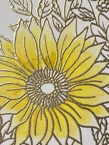 Now it’s time to watercolor my image. I choose colors that I think I want to use and press the ink cubes onto my glass mate, I will use this for my palette. To add color, I will be using a Water Brush filled with clean water. To start, I use my Water Brush to pick up some Sweet Corn Ink from my palette and add it to the base of my first petal. To remove some of the color from my Water Brush, I wipe the bristles onto a paper towel then blend the added color out towards the end of the petal. I always like to start out with a light layer of ink and build up my layers. I repeat this process for the remaining petals of both sunflowers.