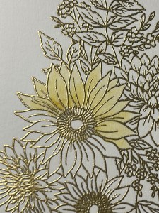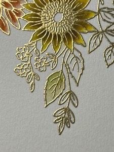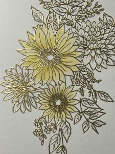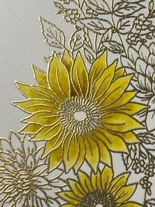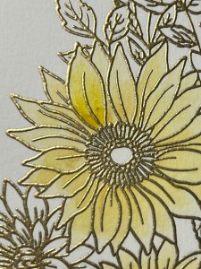 Using my Pick & Stick Tool, I add Gold Pearls to the center of the sunflowers with Liquid Glue and this completes my card.