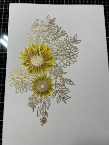 To add another color and some depth, I pick up some Wild Dandelion Ink and add it to the base of my petal then blend it out towards the end of the petal but not all the way to the tips. I repeat this for the remaining petals of both flowers.