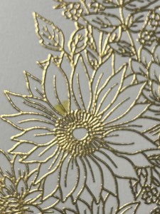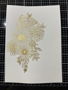 To start my card, I place a piece of Watercolor Cardstock into my MISTI Stamp Positioner and place the floral image from the Change Is Beautiful Stamp Set over it. I then prep my cardstock with my Anti Static Powder Bag and stamp the image using Versamark Ink. Next, I add Gold Embossing Powder then heat it using my Heat Tool.