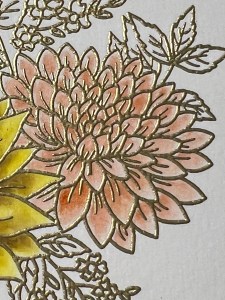 Now it’s time to work on the next flowers. Using my Water Brush, I pick up Peach Bellini Ink and add it to the base of the petal and blend it out towards the tip. I repeat this step with all remaining petals.
